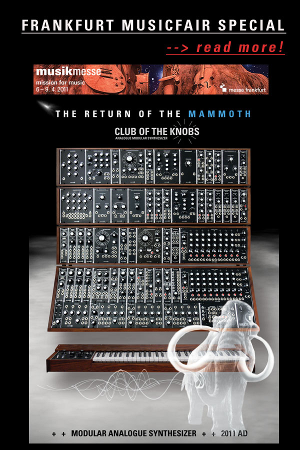June 2011 --> New descriptions for our latest modules C 907A FIXED FILTER BANK, C 911P VOLTAGE CONTROLLED POLYPHONIC ENVELOPE GENERATOR, C 951A QUAD ARPEGGIO ROUTER, C 1640 VOLTAGE CONTROLLED PHASE SHIFTER. Have a look at our "modules" site! --> C 1620 EXTENDED FOUR CHANNEL MORPH CONTROLLER - available again! --> a real introduction to our SYNTHESIZER MODEL 15 soon... |